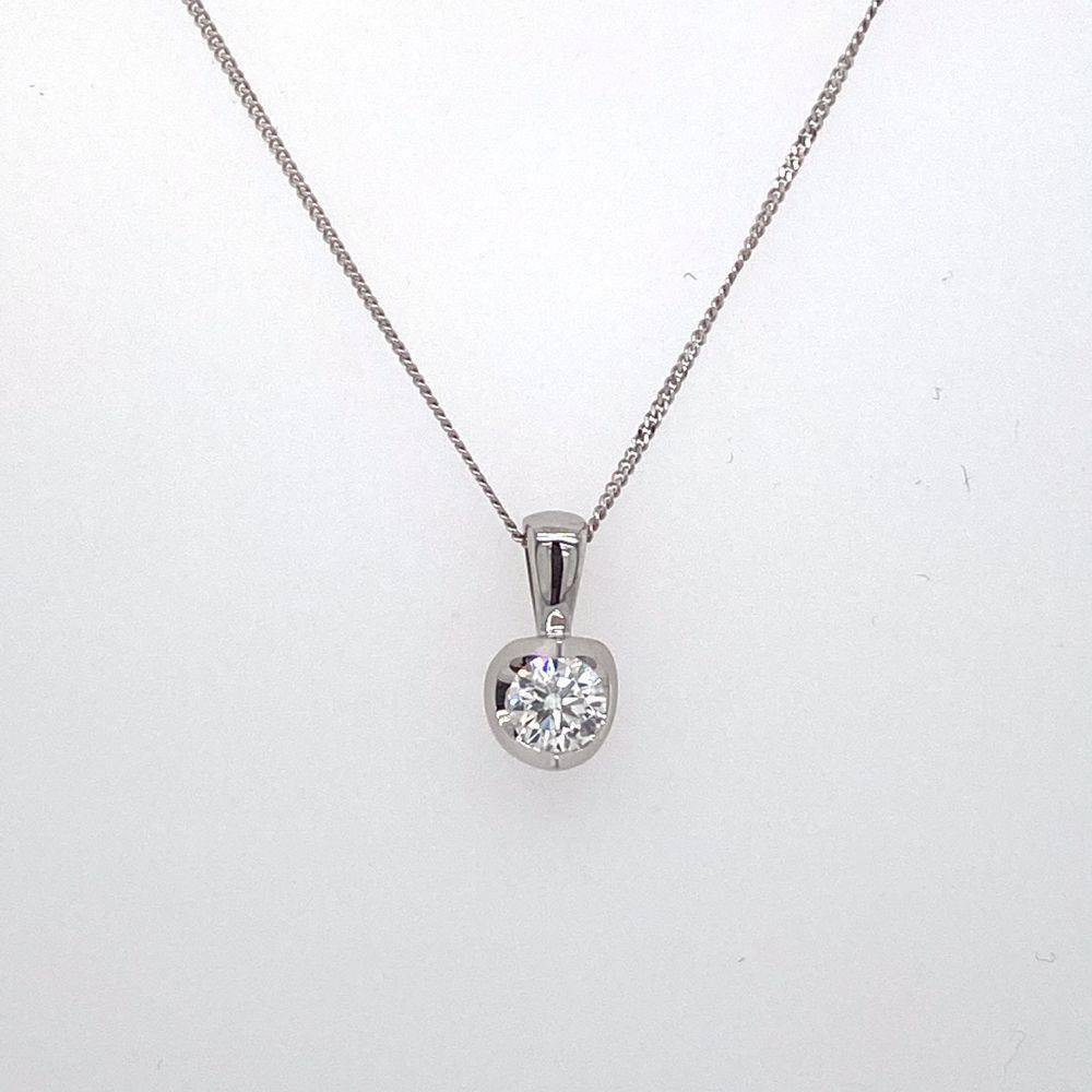 9ct white gold single stone round brilliant cut diamond arched shaped tension set pendant on a 9ct white gold fine curb chain. 46cm. 0.25ct diamond.