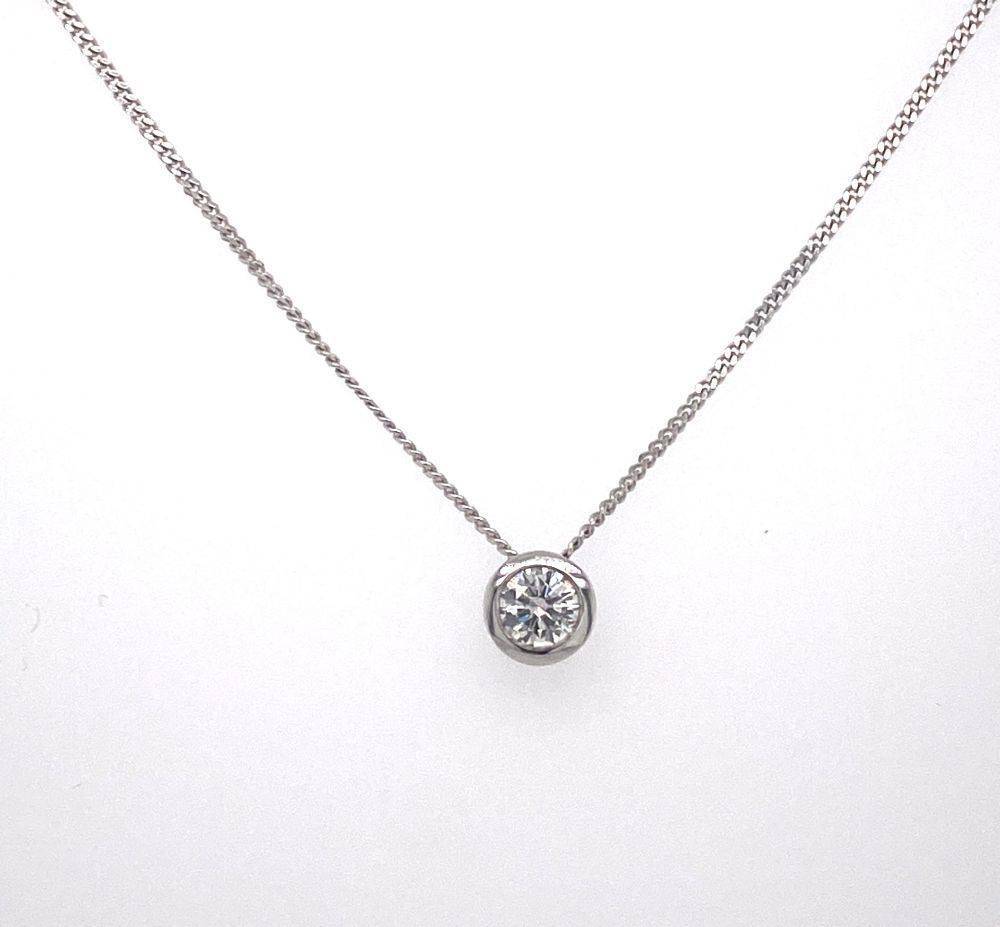 9ct white gold single stone round brilliant cut diamond pendant in a rub over setting on an adjustable 16-18″” fine curb chain. 0.25ct diamond. G/H colour. I2 clarity.