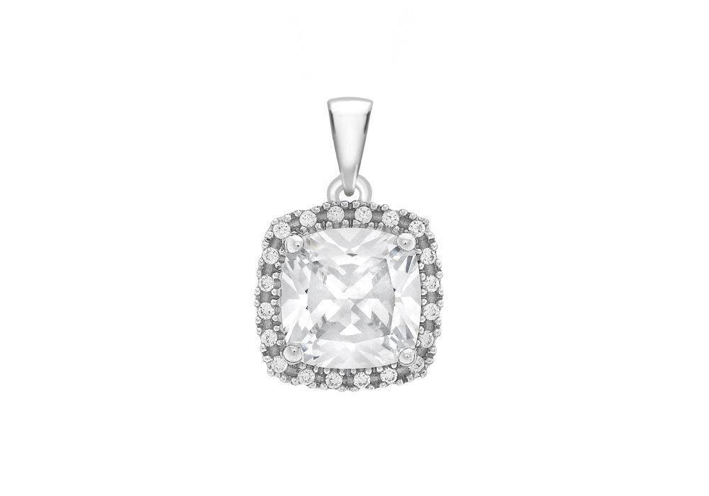 9ct white gold square cubic zirconia pendant wiith a halo of smaller round cubic zirconia. DOESN’T INCLUDE CHAIN. Chains are sold separatley