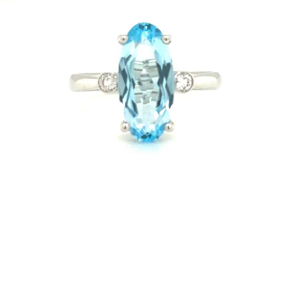 A large long oval cut blue topaz sits between two round brilliant cut diamonds with a beautiufl millegrain setting. This is all set in 9ct white gold. 4.10ct blue topaz & 0.11ct total diamond weight.