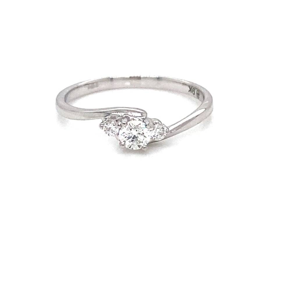 Three graduated round brilliant cut diamonds each claw set in a cross over style 9ct white gold ring mount. 0.25ct total diamond weight.
