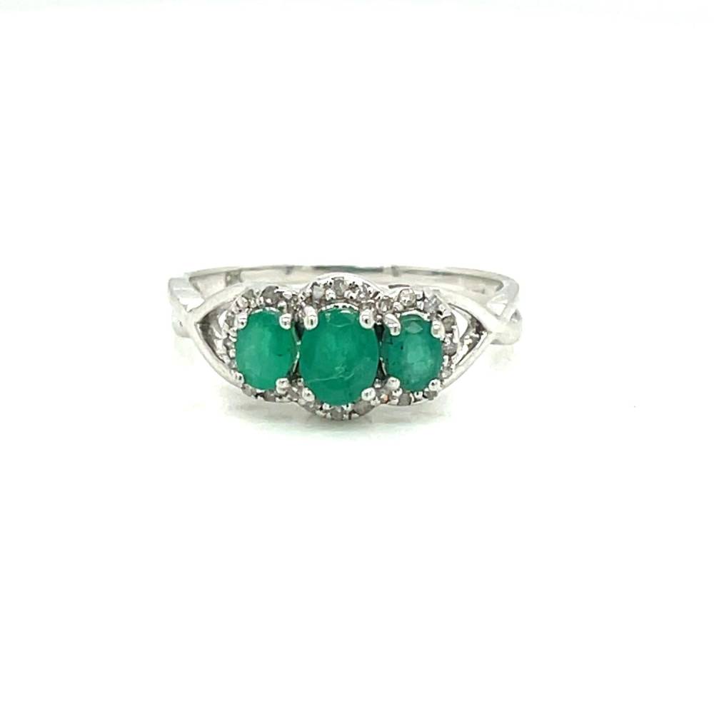 9ct white gold emerald and diamond cluster ring. Three graduated oval emeralds in the centre surrounded by a halo of smaller round brilliant cut diamonds.