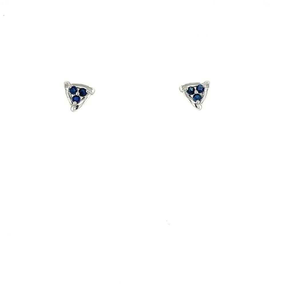 9ct white gold stud triangle shaped stud earrings set with three small round sapphires.