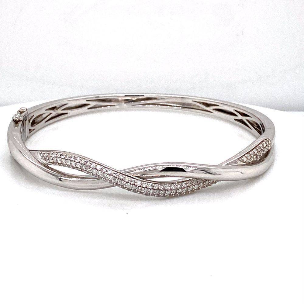 9ct white gold twiisted hinged bangle set with 134 round brillaint cut diamonds. A push in hidden catch and safety arm. A beautiful timless diamond bangle. 1.00ct total diamond weight.