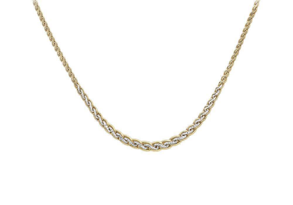 9ct yellow and white gold graduated spiga necklace. polished ywllow gold links and diamond cut white gold links. Length 43cm.