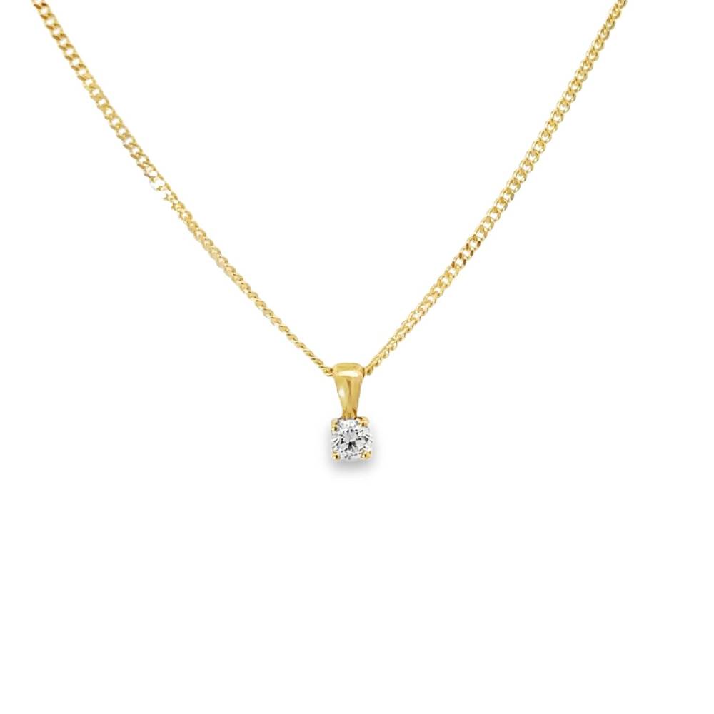 9ct yellow gold soliatire round brilliant cut damond pendant, this pendant is set in white gold in a classic four claw setting and comes on a 16-18″ adjustable 9ct yellow gold curb chain. 0.10ct diamond, G/H colour, Si clarity.