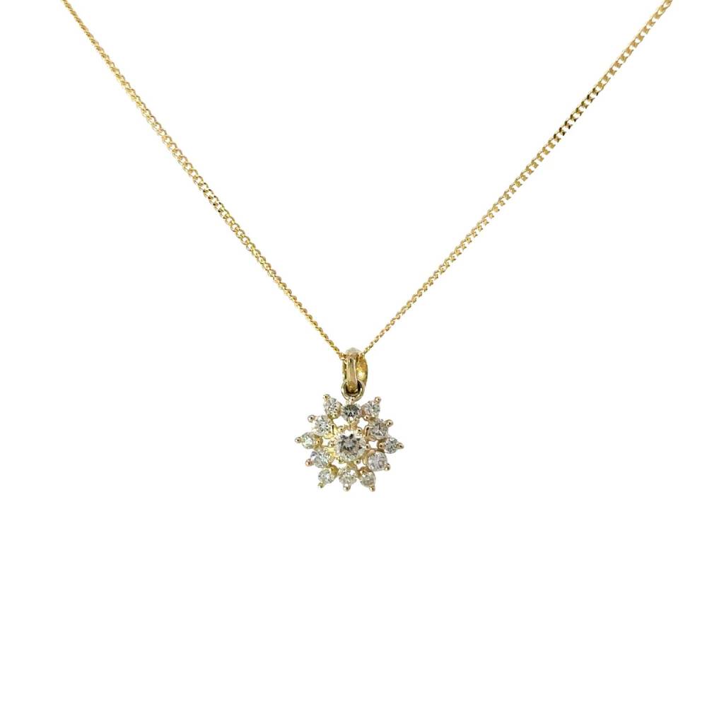 9ct yellow gold flower shaped diamond set cluster pendant on a 46cm fine yellow gold curb chain. 0.25ct total diamond weight.