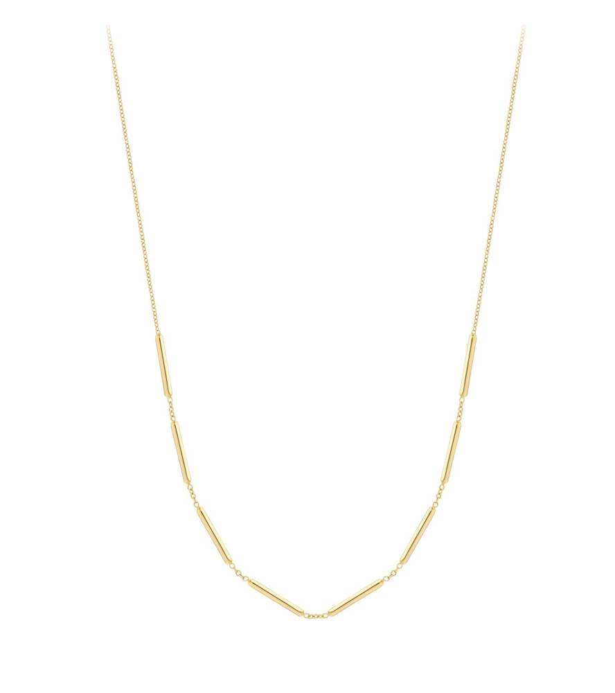 A 9ct yellow gold necklet that features eight polished elongated oval bars with proprietary fish hook clasp. Aprroximately 17″/43cm