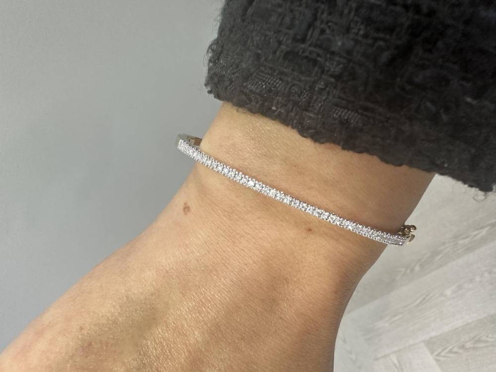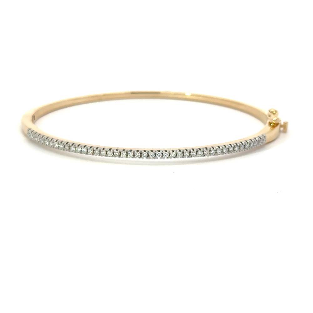 9ct yellow gold oval hinged bangle set with a row of fine claw set round brilliant cut diamonds in white gold. This bangle has a push in catch and safety arm.