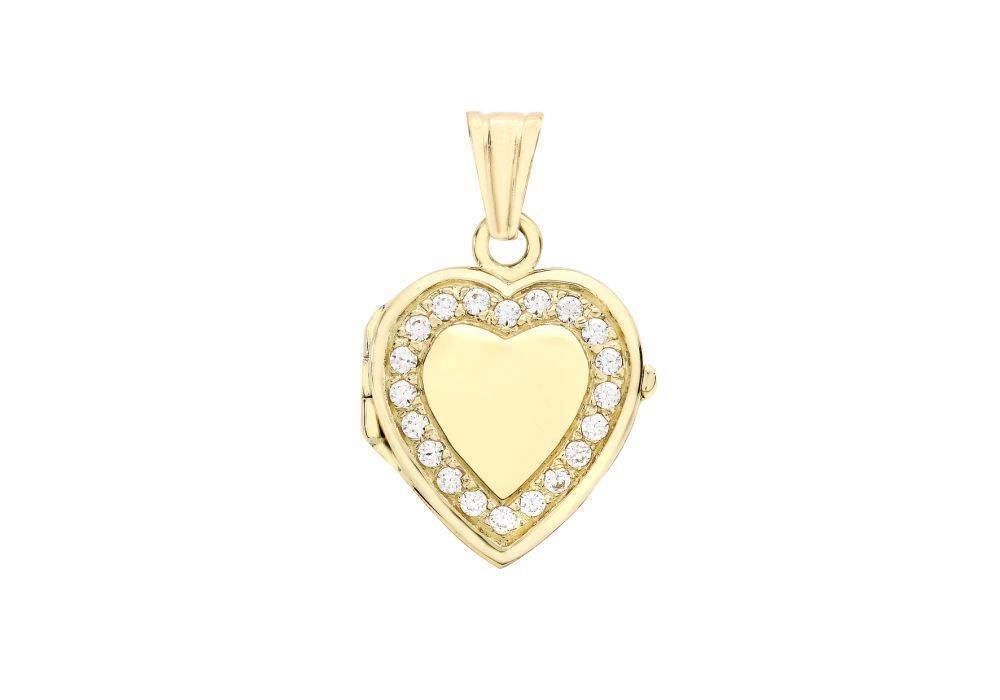 9ct yellow gold heart shaped locket with a cubic zirconia edge. DOES NOT INCLUDE CHAIN. Chains are sold separately. Size 20mm x 16mm.