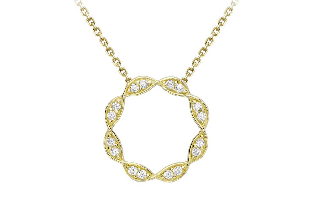 9ct yellow gold open twist circle set with cubic zirconia on a adjustable 16-18″ chain. Pendant 12mm diameter.