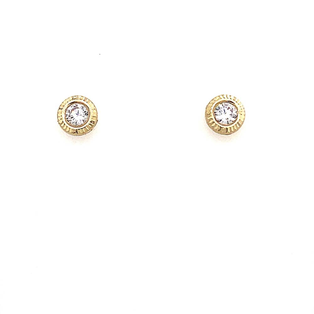 9ct yellow gold single cubic zirconia stud earrings with a diamond cut edge.