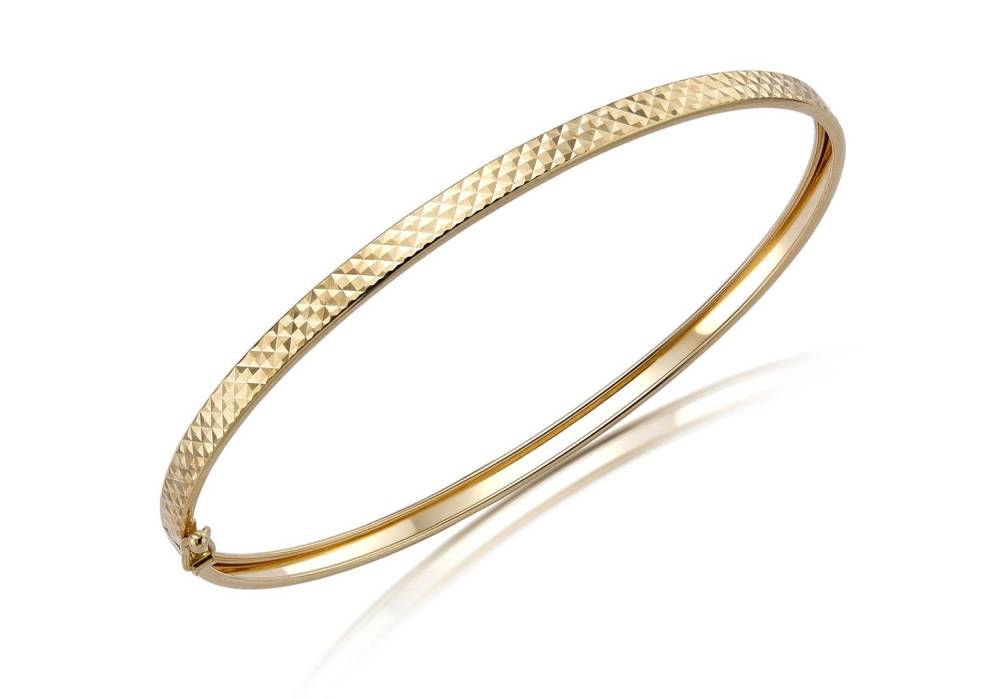 9ct yellow gold flat diamond cut oval bangle. 59.5mm x 54.5mm.