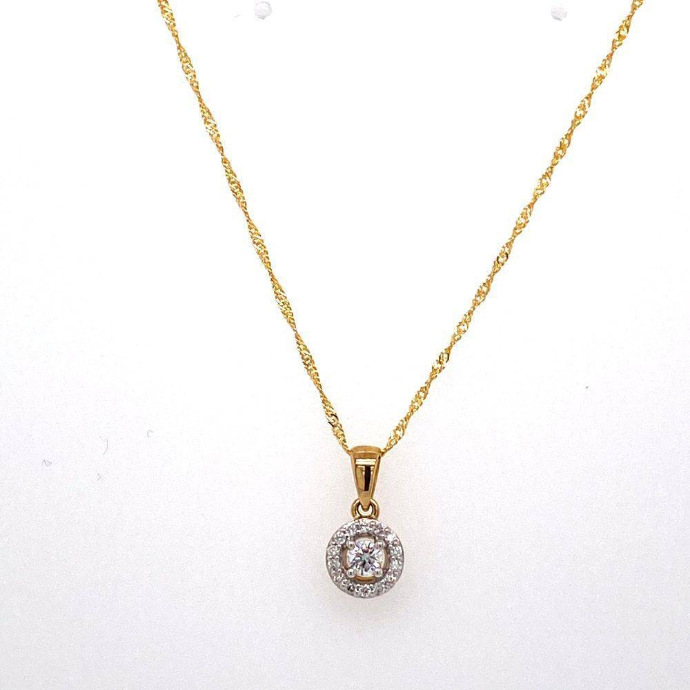 9ct yellow gold round brilliant cut diamond halo pendant, a single diamond in the centre surrounded by a halo of smaller diamonds. This pendant comes on a 16″” twist curb chain.