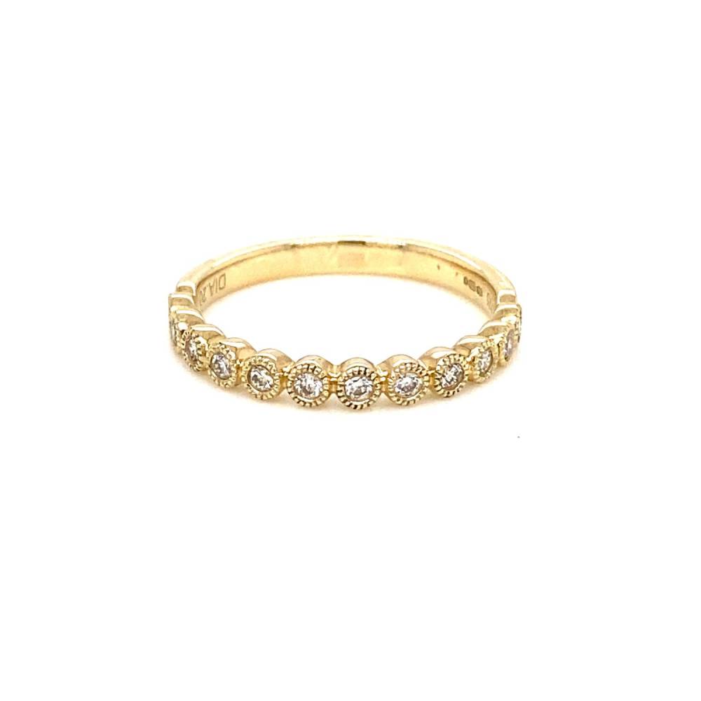 9ct yellow gold twelve stone round brilliant cut diamond half eternity style ring in a rub over setting with a millegrain edge. 0.20ct total diamond weight.