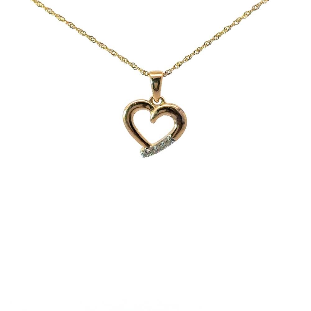 9ct yellow gold open heart pendant set with four round brilliant cut diamonds. This pendant comes on a 16″ 9ct yellow gold twist curb chain.