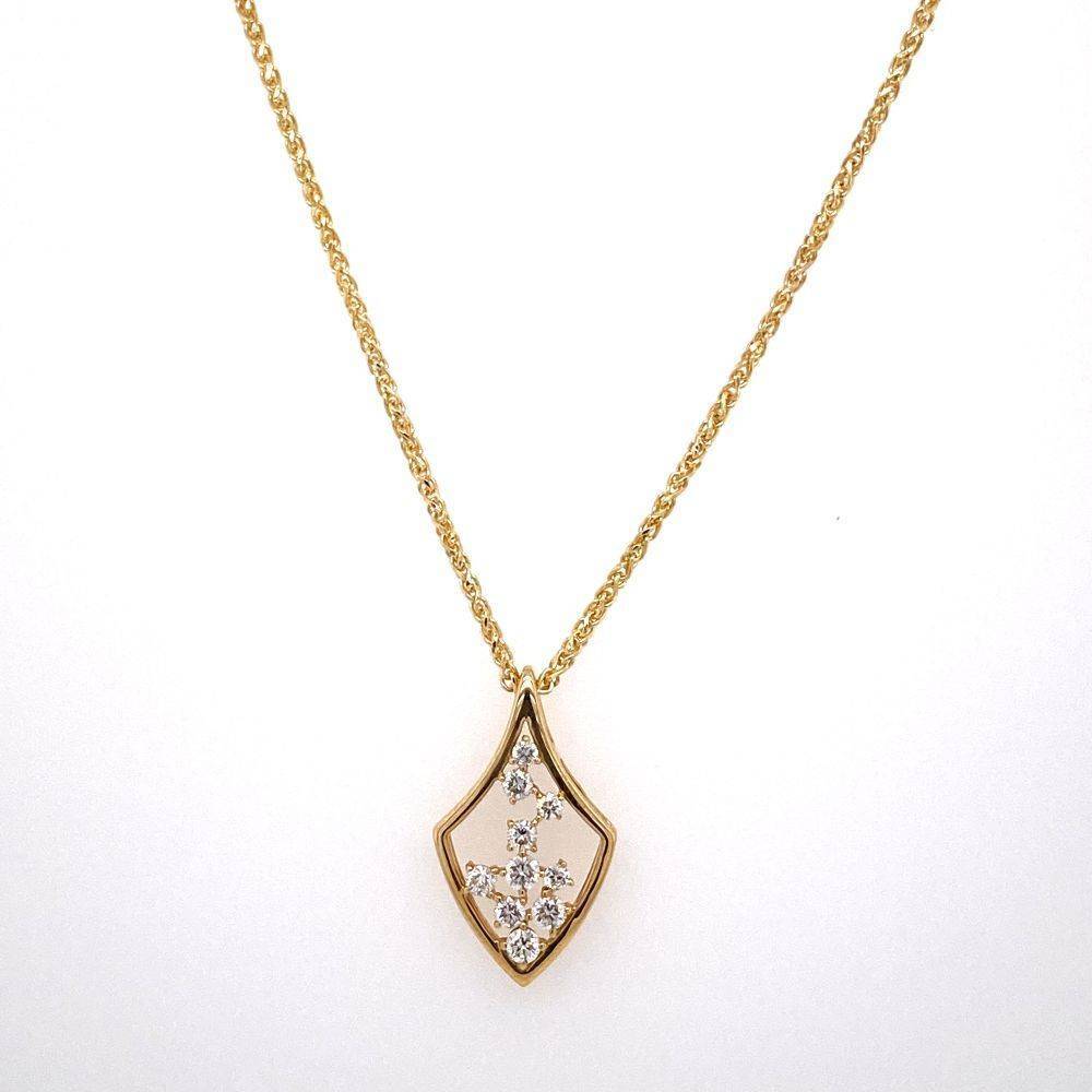 9ct yellow gold open diamond shaped pendant scatter set with ten round brilliant cut diamonds on a 9ct yellow gold 16″” chain. 0.20ct total diamond weight.
