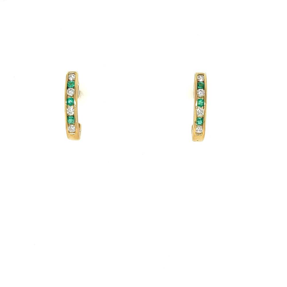 9ct yellow gold emerald and diamond channel set half hoop style earrings.