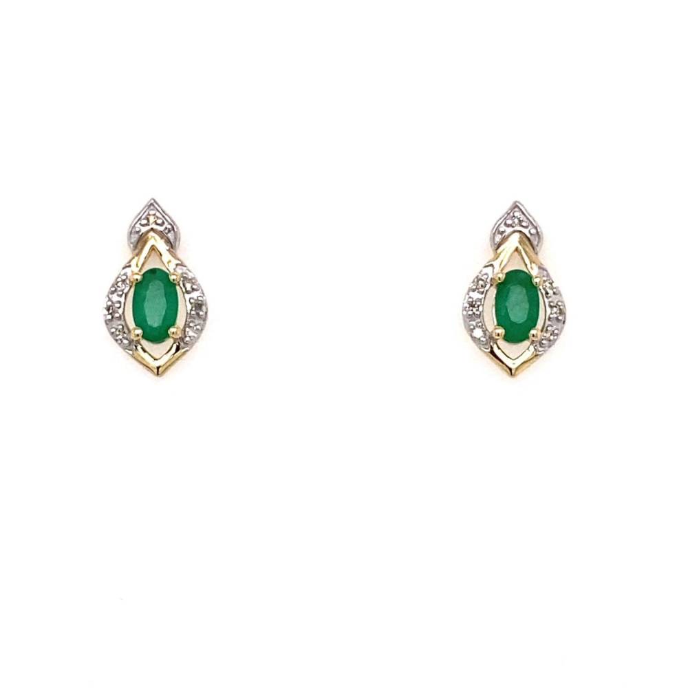 9ct yellow gold oval emerald stud earrings with a fancy shaped diamond set surround.