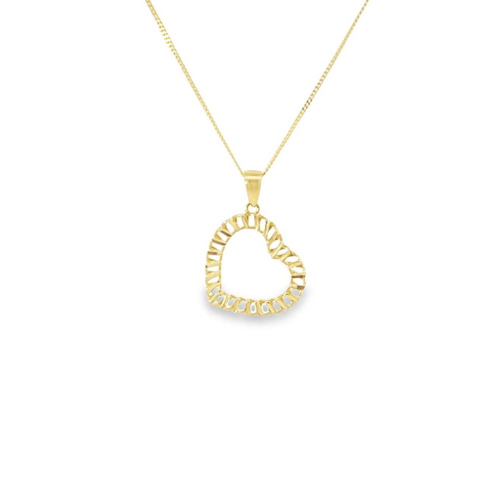 9ct yellow gold fancy open hanging heart pendant on a fine 18″ curb chain.