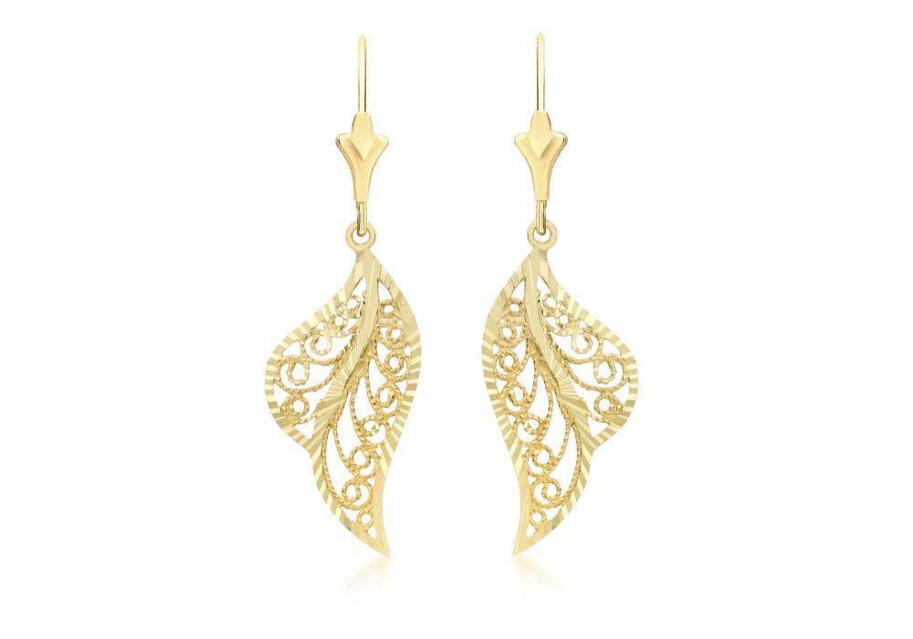 9ct yellow gold filigree leaf design drop earrings. Hook fitting. 24mm drop.