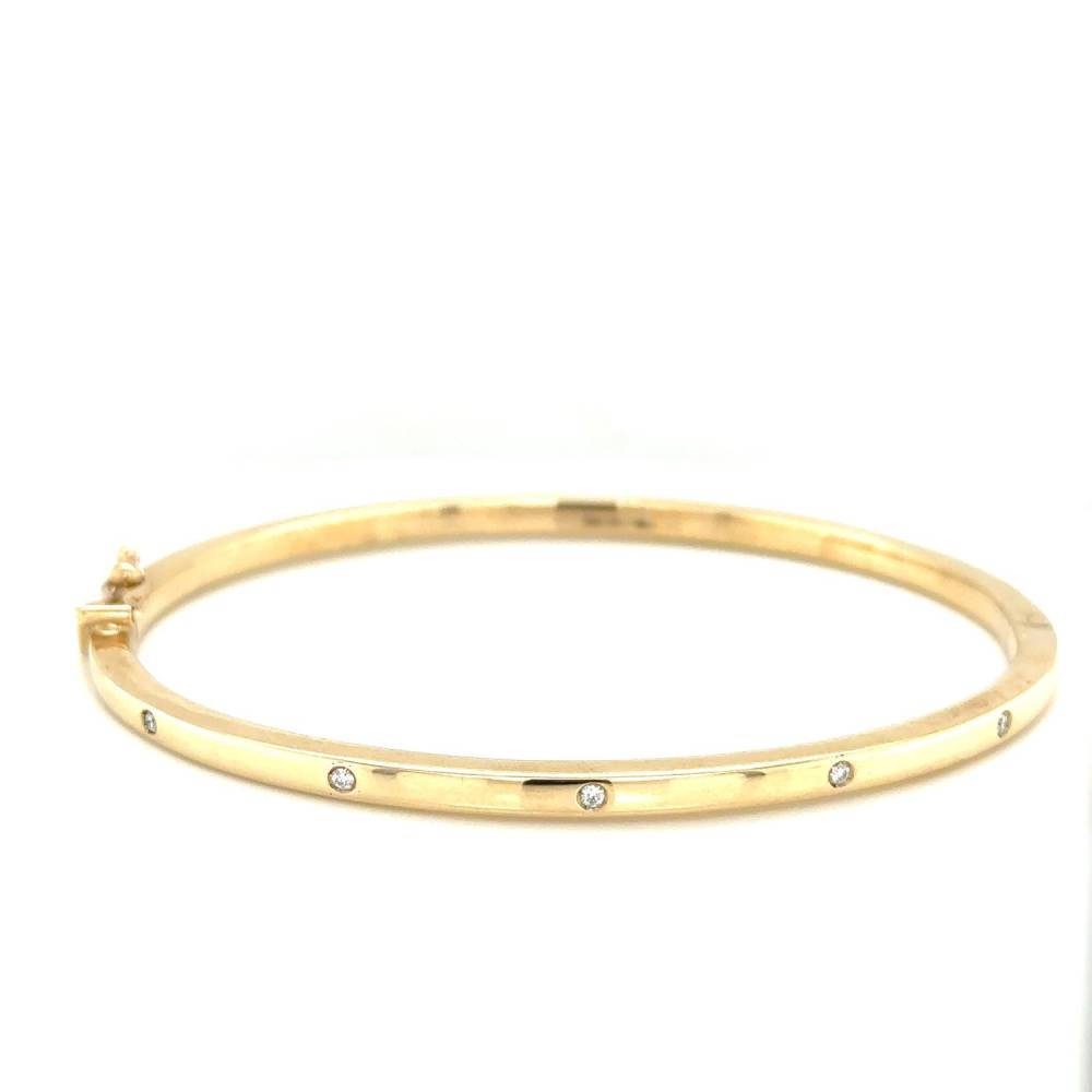 9ct yellow gold five stone flush set round brilliant cut diamond hinged bangle.