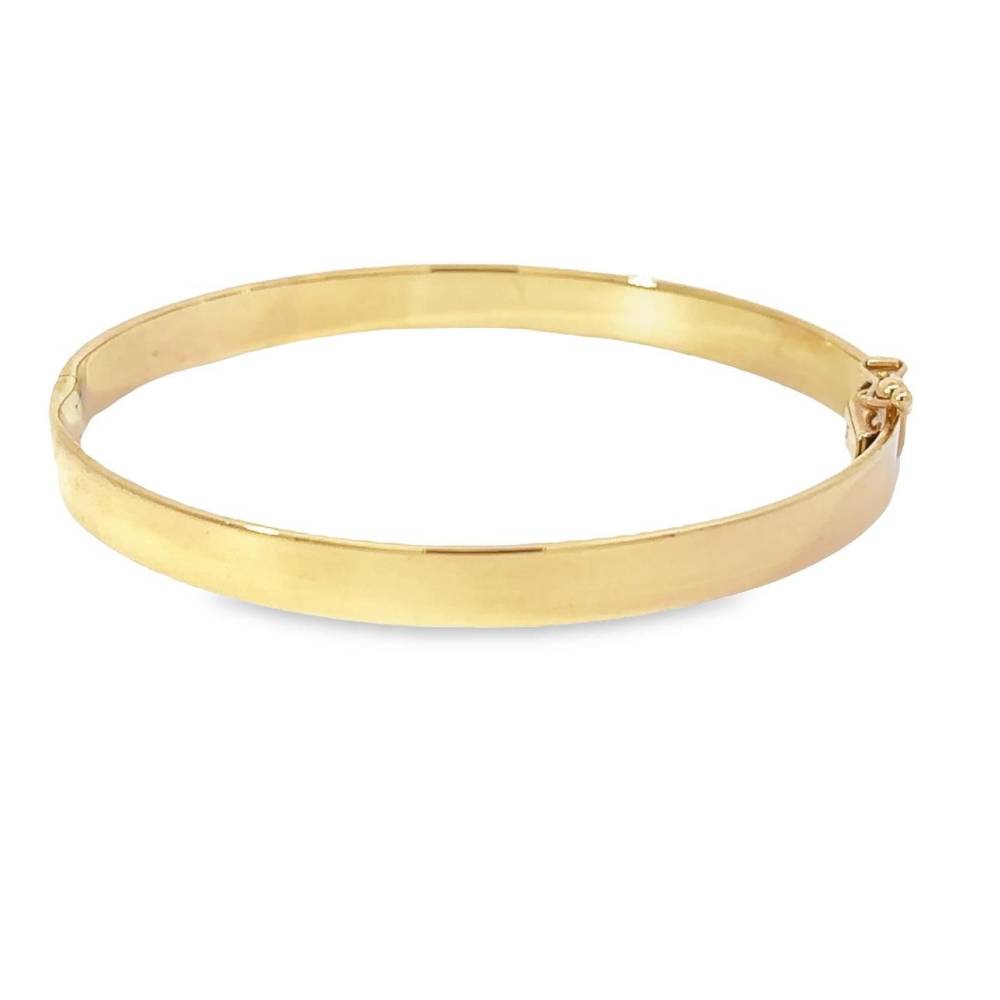9ct yellow gold flat oval hinged solid bangle with a push in catch and safety arm. Internal measurement 61mm x 57mm. Width 6mm.