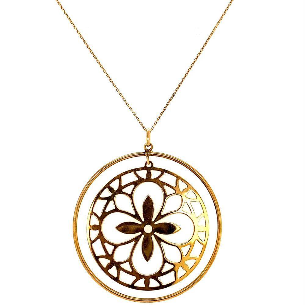 9ct yellow gold large disc with a fancy cut out flower design on an adjustable 16 -18″” chain.