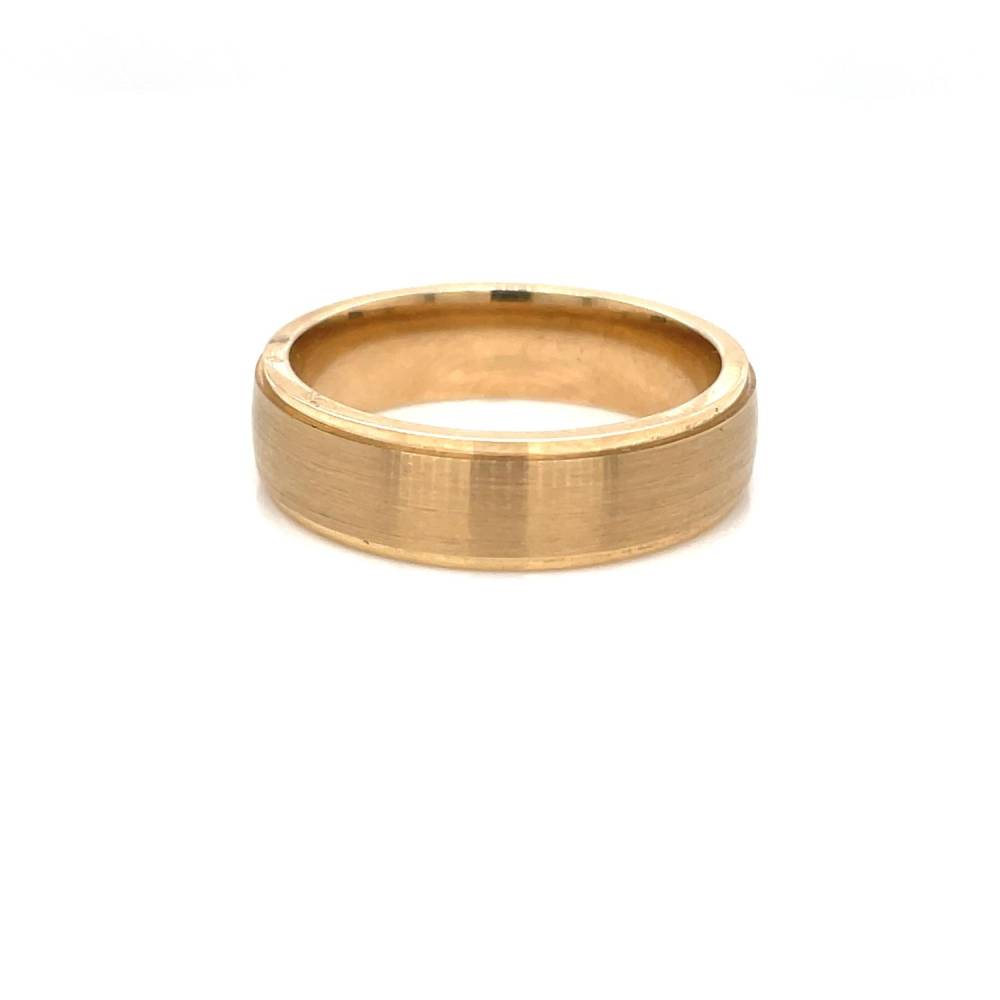 9ct yellow gold brushed centre wedding ring with fine polished edges. This ring is 6mm wide but is available in all other widths and precious metals, please enquire for more details.