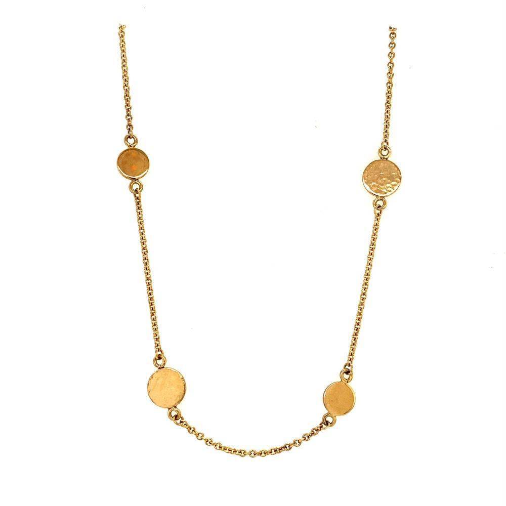 9ct yellow gold necklace with equally spaced hammered round discs. Length 18″”.