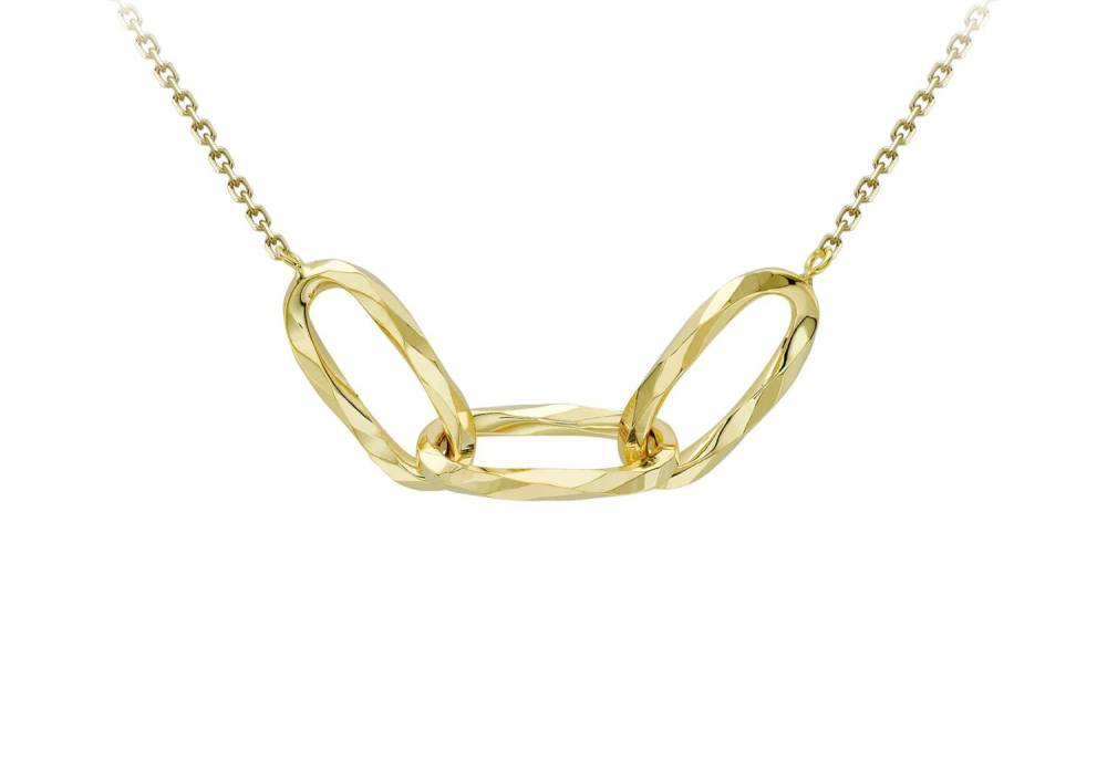 9ct yellow gold three diamond cut interlocking ovals necklace. Adjustable 17-18″ chain.