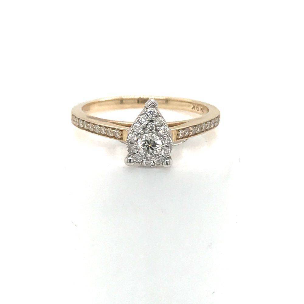 9ct yellow gold round brilliant cut diamond invisible set pear shaped cluster ring with grain set diamond set shoudlers. The invisible setting of this ring gives the illusion of just one centre diamond. Total diamond weight 0.33ct.