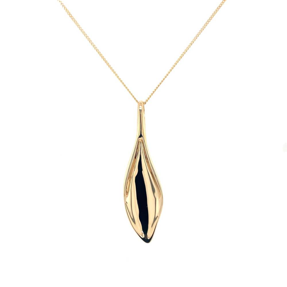 9ct yellow gold long concave polished pendant on a 46cm 9ct yellow gold chain. A simple yet beautiful gold pendant.