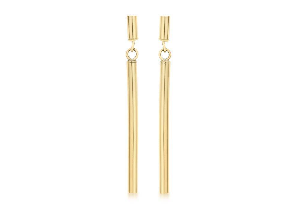 9ct yellow gold long rube drop earrings with pillar and scroll stud fittings. Drop 41mm.