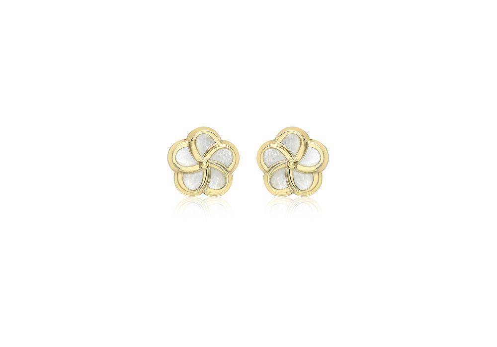 9ct yellow gold mother of pearl flower stud earrings. Diameter 8.5mm. Pillar and scroll fittings.