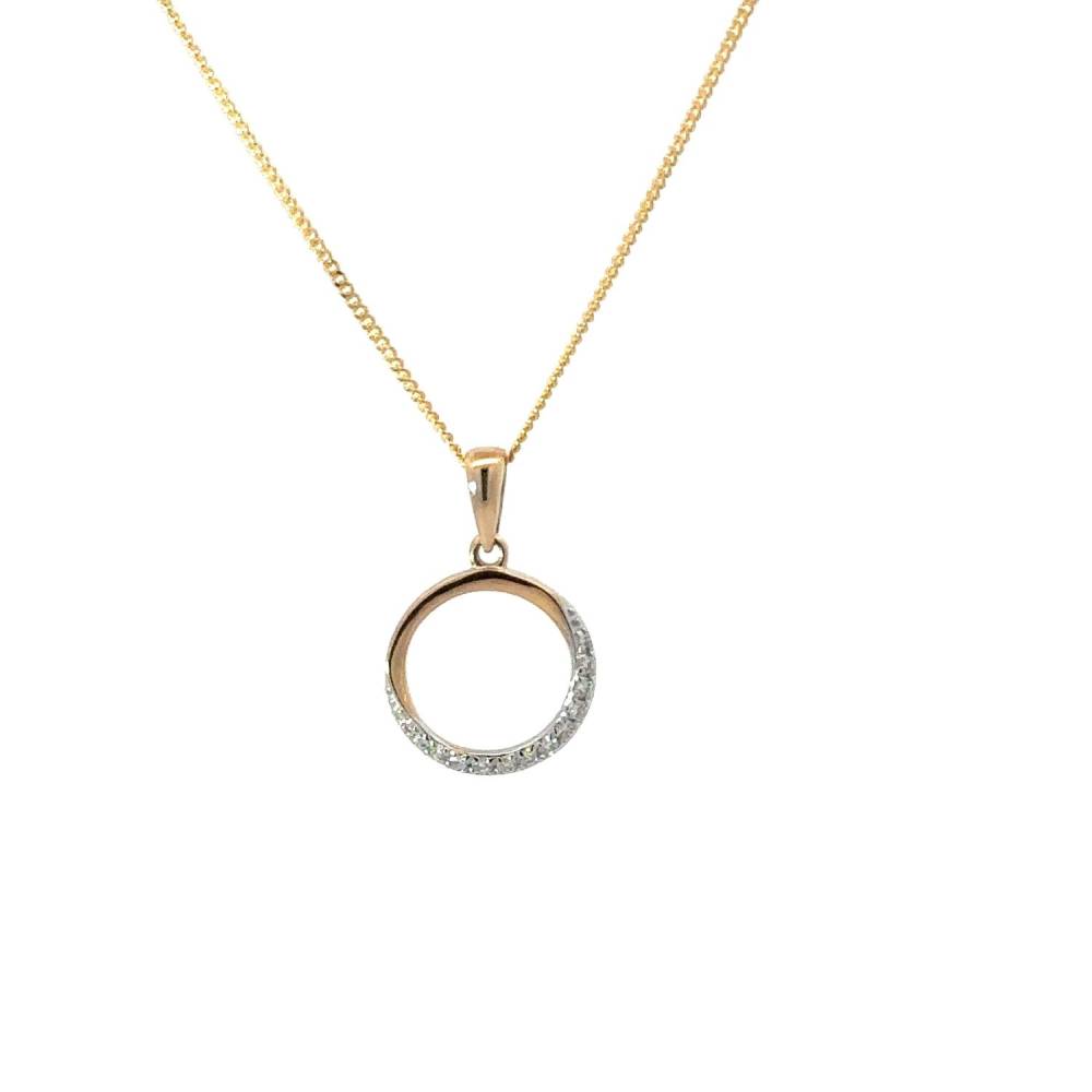 9ct yellow gold open circle pendant set with round brilliant cut diamonds. A beautiful, timeless pendant. This pendant comes on a 42cm fine curb chain. 0.07ct total diamond weight.