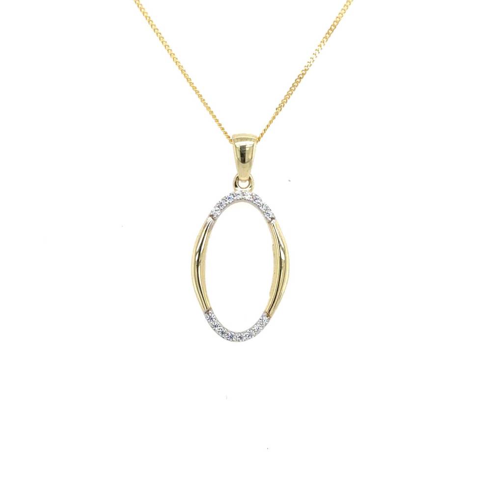 9ct yellow gold open oval pendant set with cubic zirconia, this pendant comes on a 16″ fine curb chain.