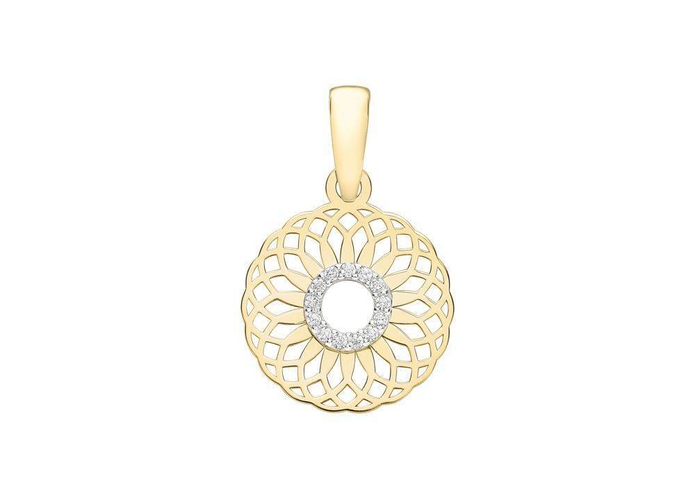 9ct yellow gold open sprial deisgn circle pendant with a smaller circle set with cubic zirconia. DOES NOT INCLUDE CHAIN. Chains are sold separately. Pendant diameter 15mm.