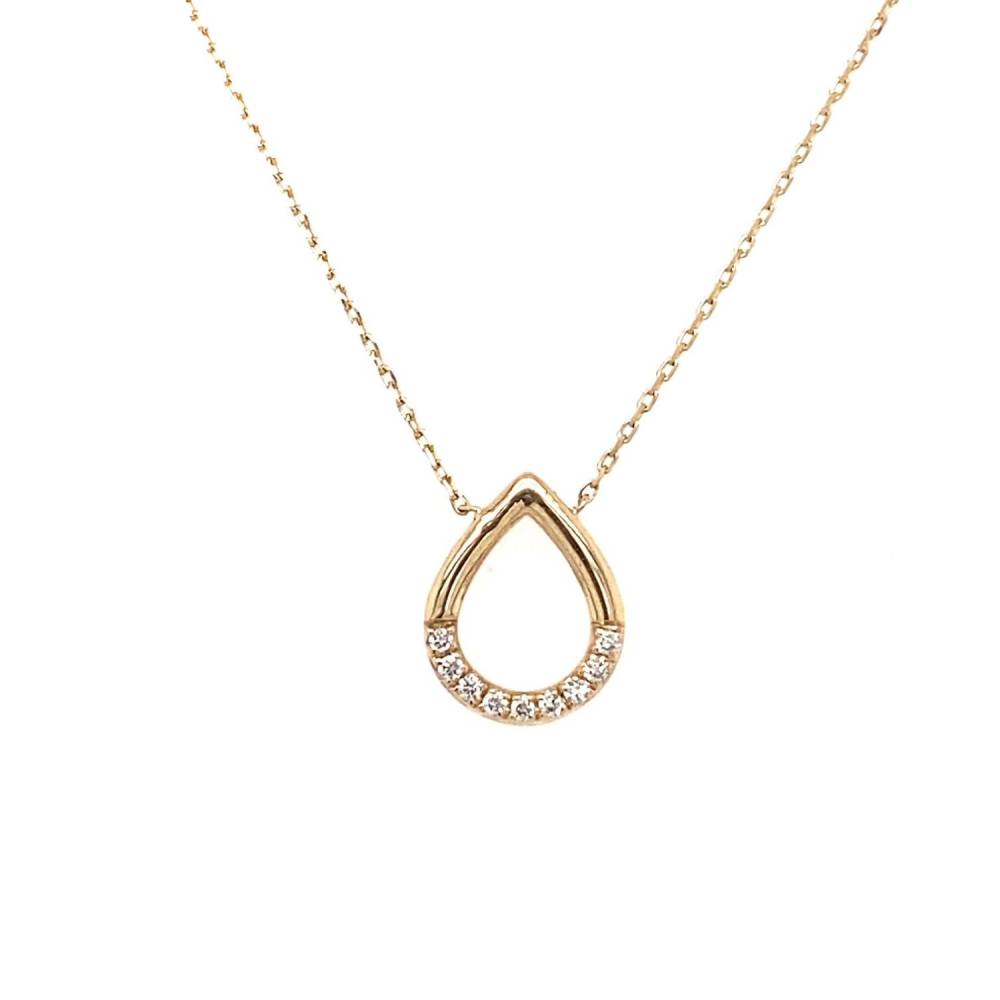 9ct yellow gold open teardrop shaped pendant necklace set with round brilliant cut diamonds. Adjustable 15-16″ length.