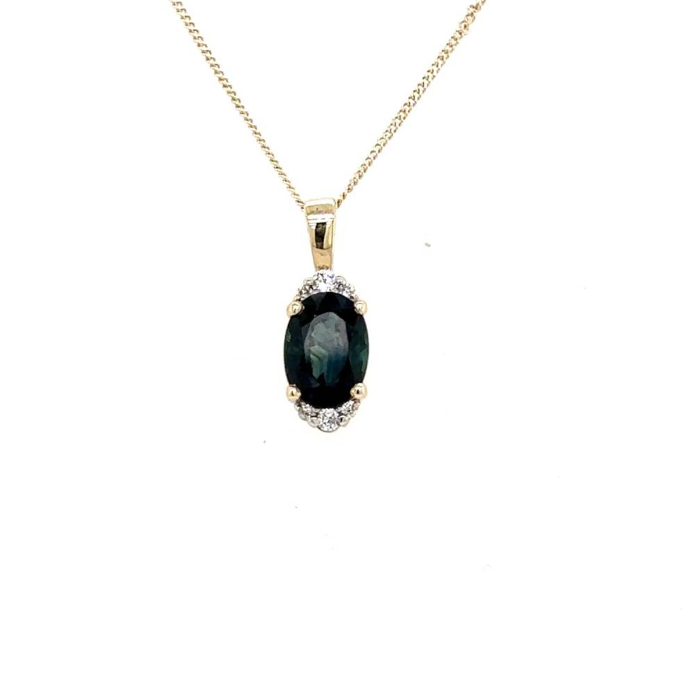 9ct yellow gold oval blue sapphire with round brilliant cut diamonds set above and below. This pendant comes on a 9ct yellow gold 46cm chain.