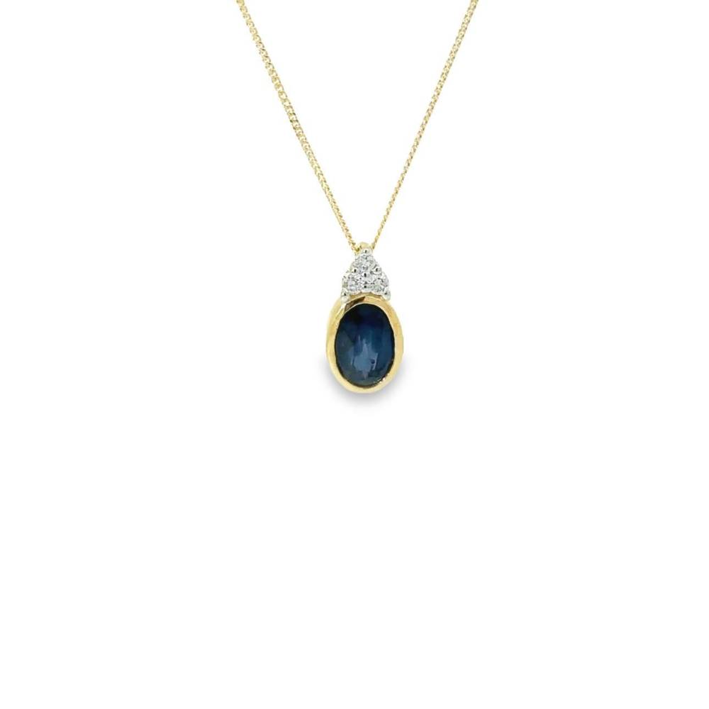 9ct yellow gold pendant set with a rub over set blue sapphire with three diamonds set in a cluster above. This pendant comes on a 9ct yellow gold 18″ chain.