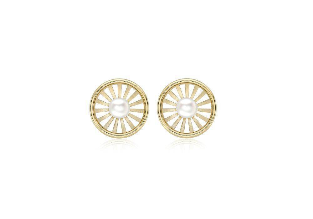 9ct yellow gold freshwater pearl earrings surrounded by an open sunray. Diameter 12.5mm. Pillar and scroll stud earring fittings.