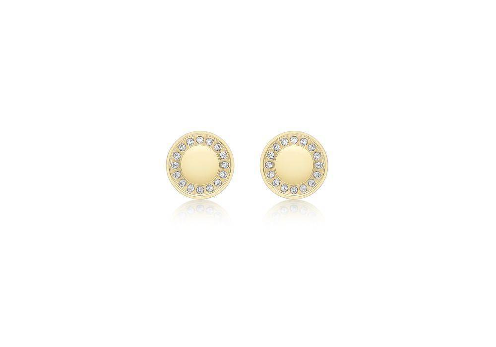 9ct yellow gold round disc stud earrings with a cubic zirconia edge. 9.5mm diameter. Pillar and scroll fittings.