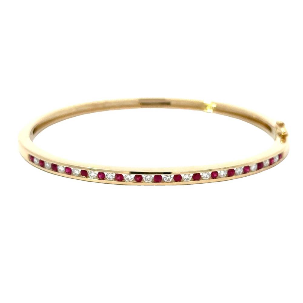 9ct yellow gold bangle adorned with radiant rubies and round brilliant cut diamonds in a channel setting. This bangle is hinged and has a push in catch and safety arm. 0.75ct total ruby weight and 0.50ct total diamond weight.