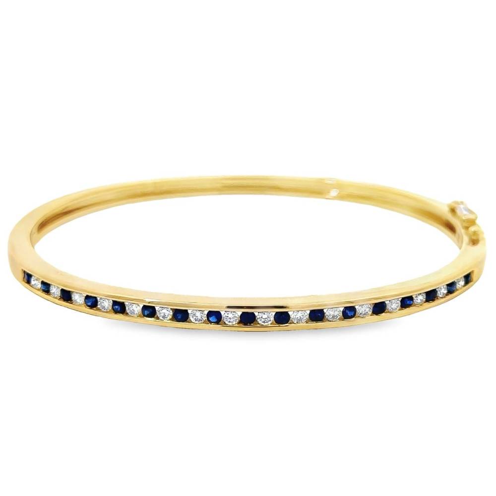 9ct yellow gold bangle channel set with alternate round blue sapphire and round brilliant cut diamonds. Hinged bangle with a push in catch and safety arm.
