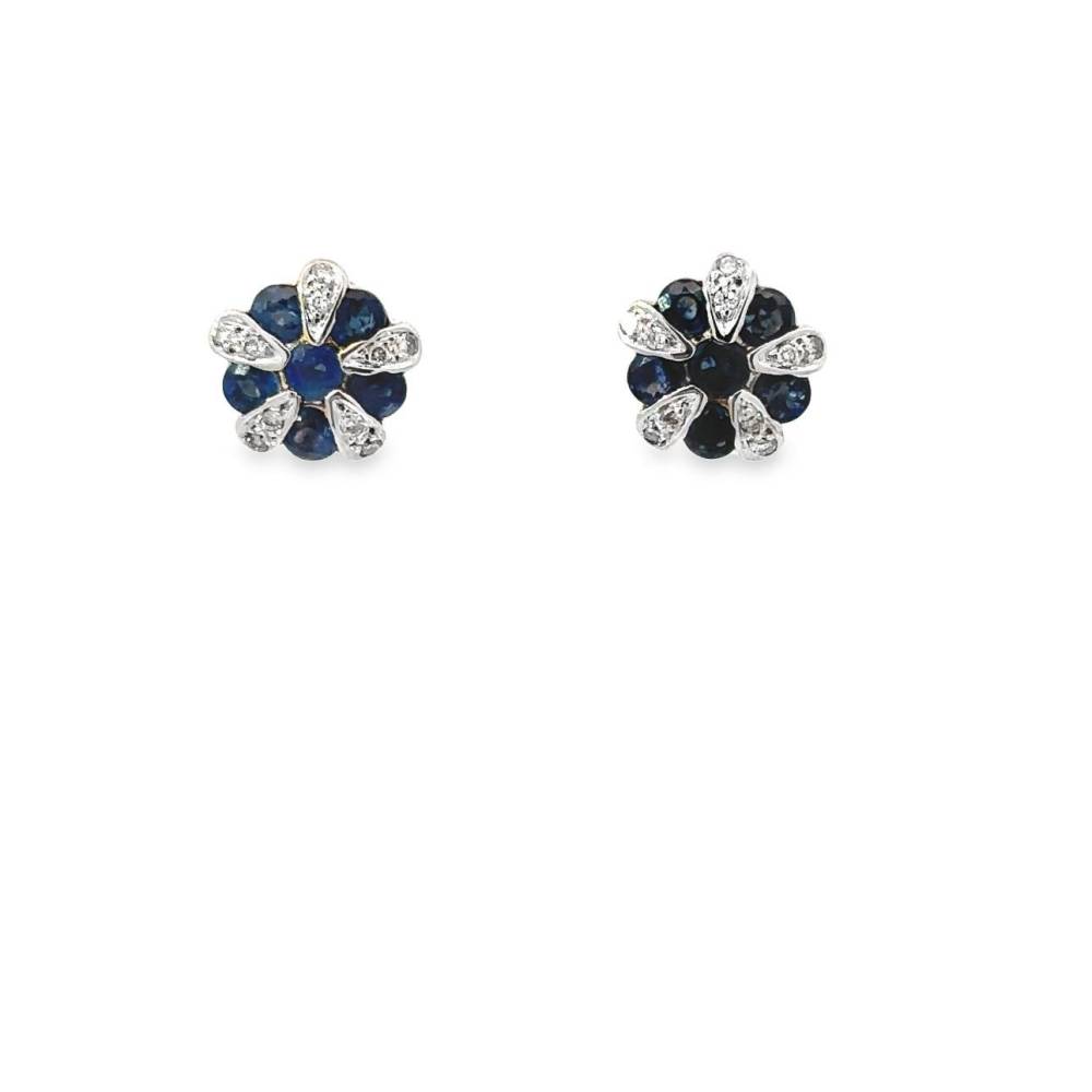 9ct yellow and white gold round sapphire and diamond round flower cluster stud earrings. Set in white gold with a 9ct yellow gold pillar and scroll stud earring fittings. 0.08ct total diamond weight. Matching pendant available.