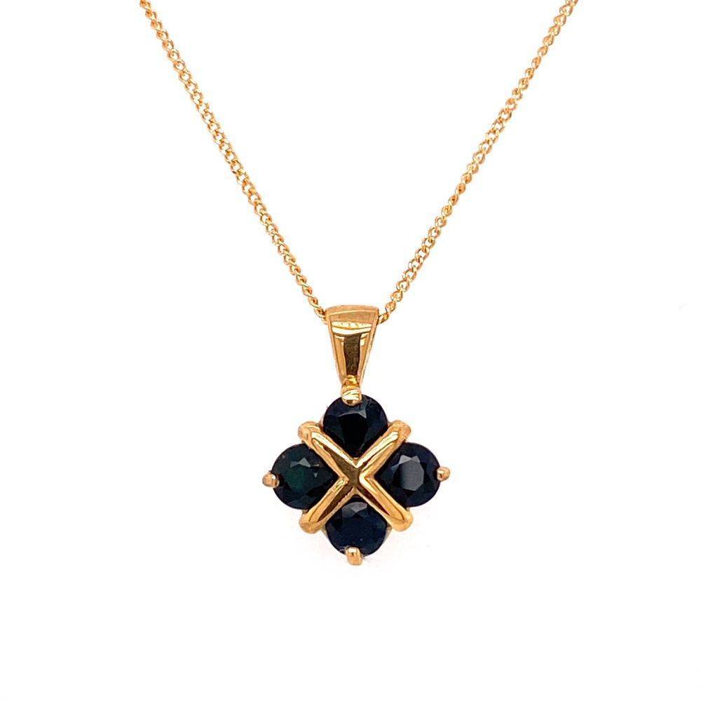 9ct yellow gold four stone sapphire ‘x’ pendant on a 9ct yellow gold on a 9ct yellow gold 17″” curb chain.