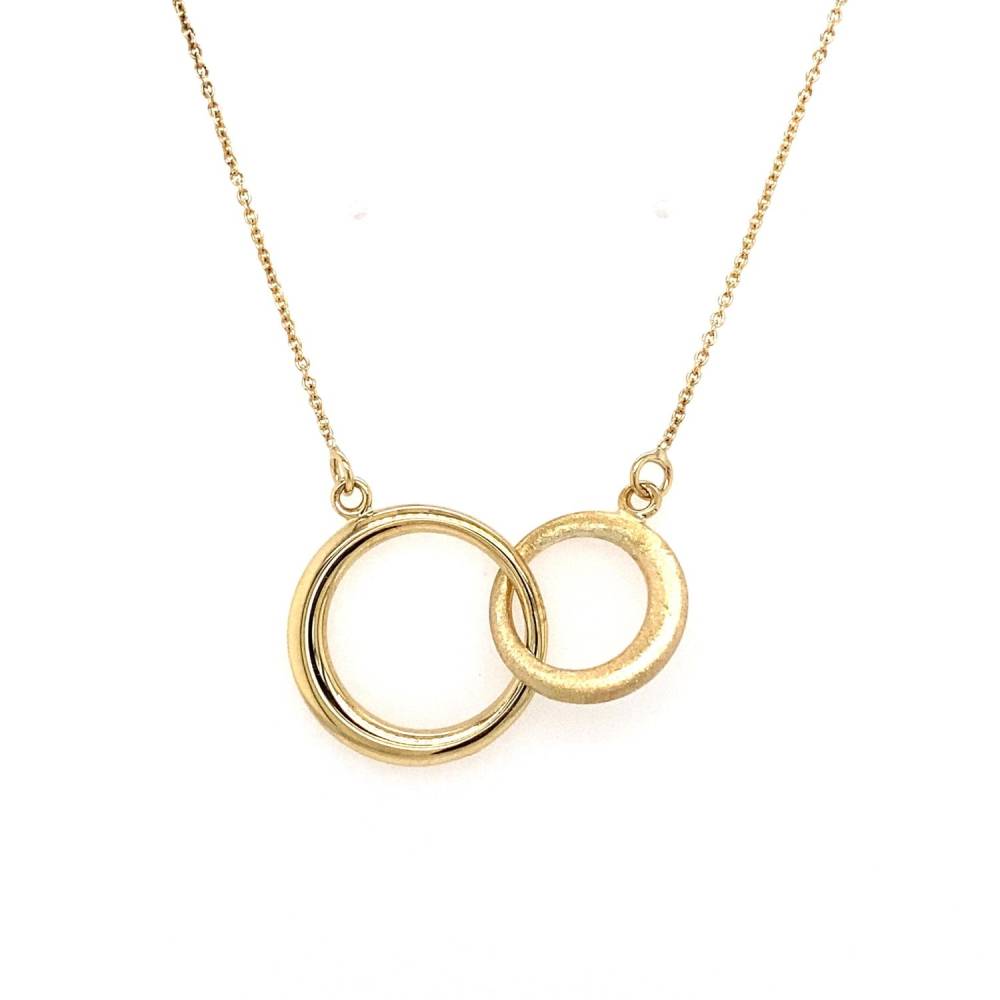 9ct yellow gold statin and polished double circle interlocking necklace. Length 43cm. Matching earrings available.