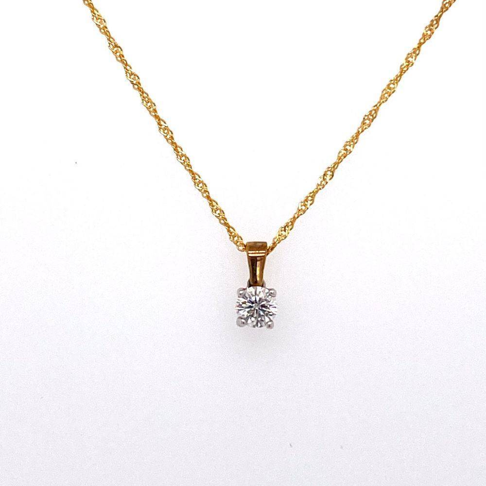 9ct yellow gold single stone round brilliant cut diamond pendant (white gold claws) on a 16″” 9ct yellow gold twist curb chain.