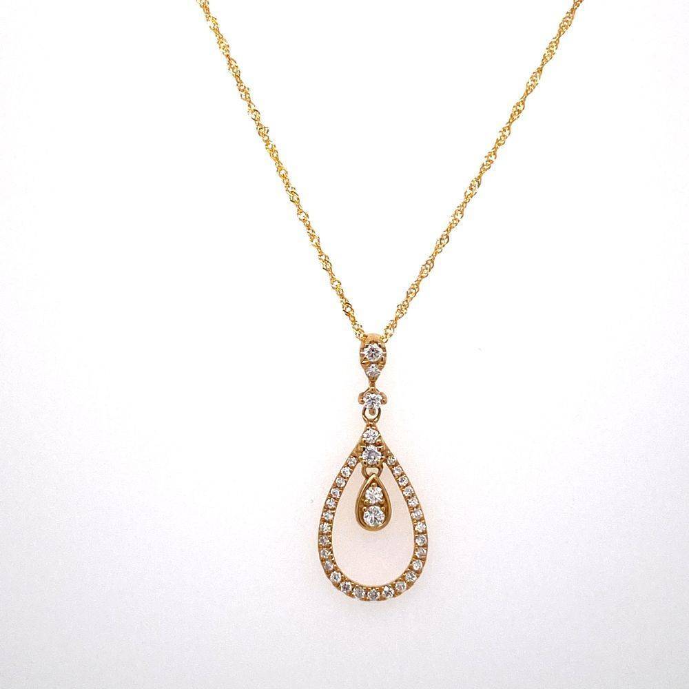 9ct yellow gold fancy teardrop shaped pendant set with round brilliant cut diamonds on a 18″” twist curb chain. 0.27ct total diamond weight.